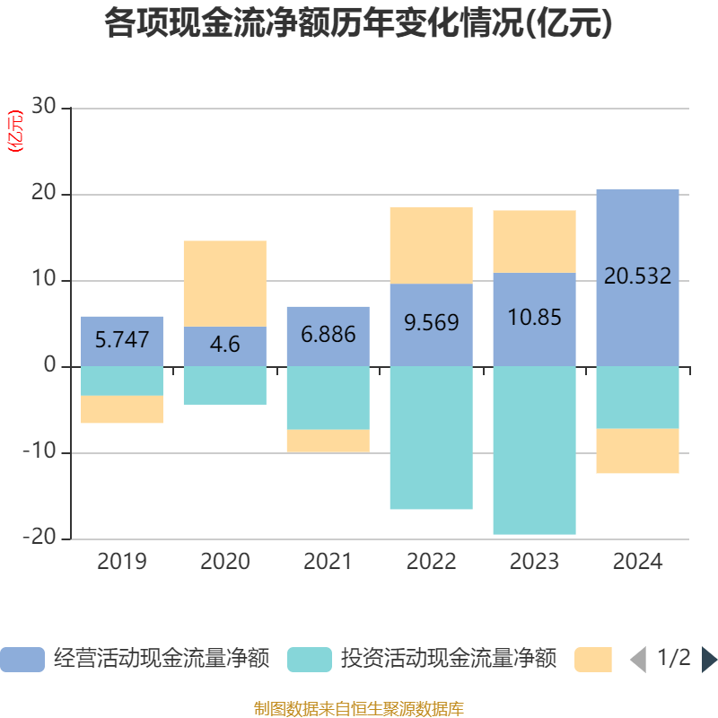 截至2024年,公司经营活动现金流净额为20.53亿元,同比增长89.24%;筹资活动现金流净额-5.17亿元,同比减少12.39亿元;投资活动现金流净额-7.26亿元,上年同期为-19.54亿元。