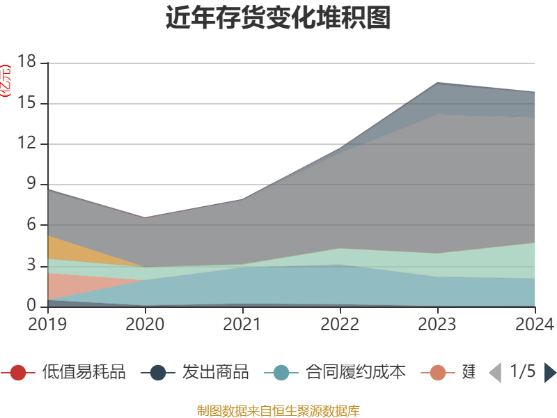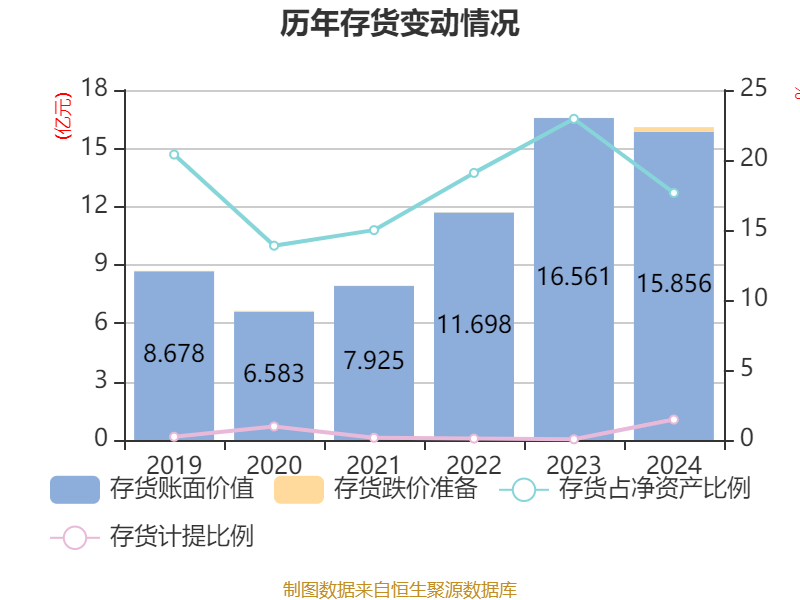从存货变动来看,截至2024年末,公司存货账面价值为15.86亿元,占净资产的17.65%,较上年末减少7049.06万元。其中,存货跌价准备为2347.63万元,计提比例为1.46%。