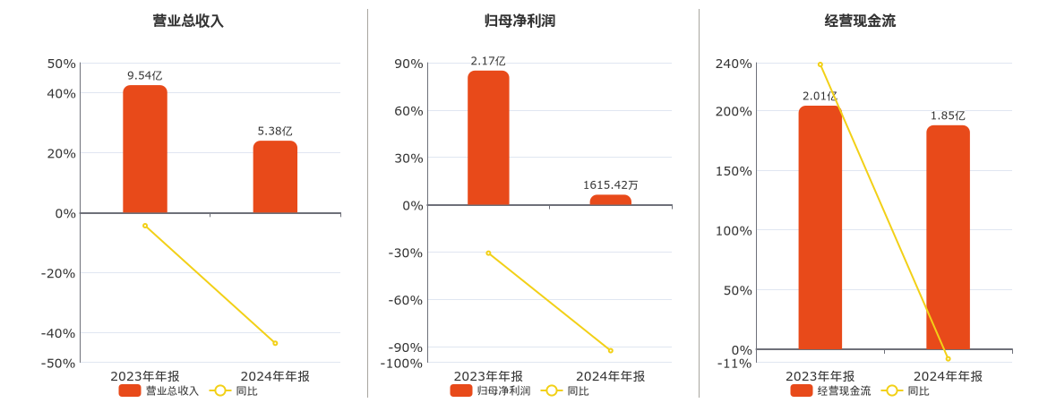 公司营业总收入为5.38亿元,在已披露的同业公司中排名第31,较去年同报告期营业总收入减少4.16亿元,同比较去年同期下降43.62%。归母净利润为1615.42万元,在已披露的同业公司中排名第29,较去年同报告期归母净利润减少2.01亿元,同比较去年同期下降92.57%。经营活动现金净流入为1.85亿元,较去年同报告期经营活动现金净流入减少1610.41万元,同比较去年同期下降8.03%。