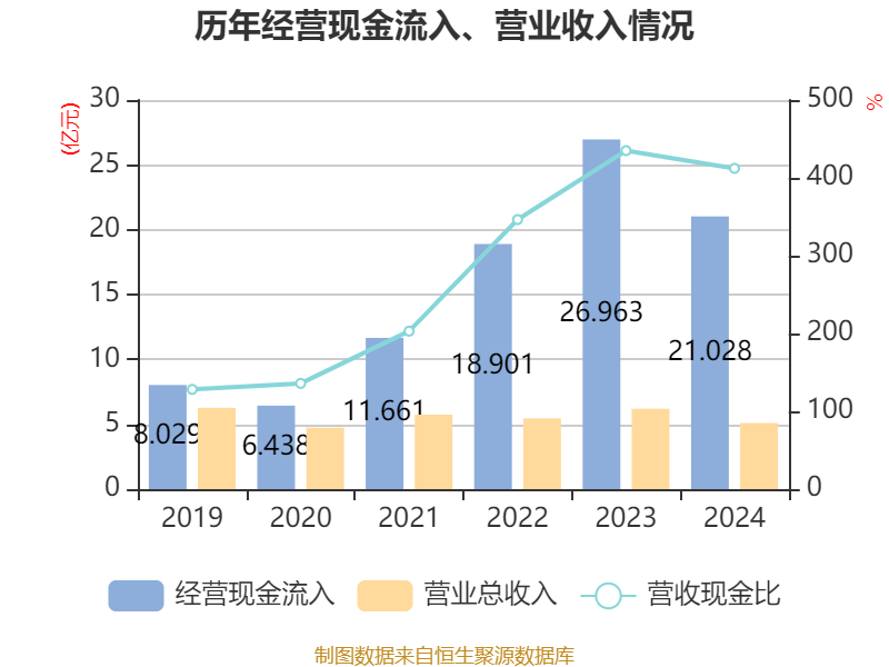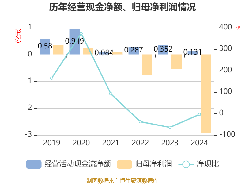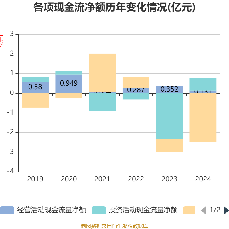 截至2024年,公司经营活动现金流净额为1307.76万元,同比下降62.89%;筹资活动现金流净额-2.47亿元,同比减少1.79亿元;投资活动现金流净额6402.25万元,上年同期为-2.32亿元。