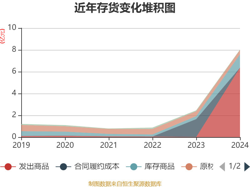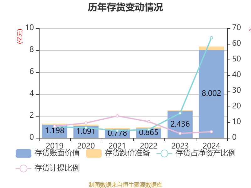 从存货变动来看,截至2024年末,公司存货账面价值为8亿元,占净资产的63.88%,较上年末增加5.57亿元。其中,存货跌价准备为3274.6万元,计提比例为3.93%。