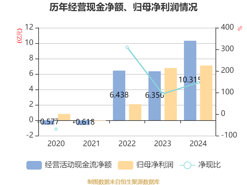 截至2024年,公司经营活动现金流净额为10.32亿元,同比增长62.29%;筹资活动现金流净额-3918.61万元,同比减少679.76万元;投资活动现金流净额5361.67万元,上年同期为-2.22亿元。