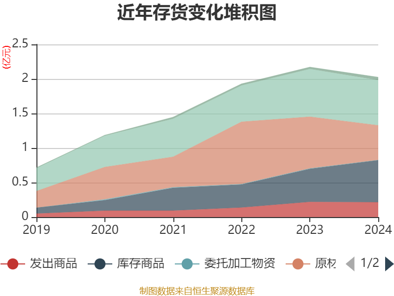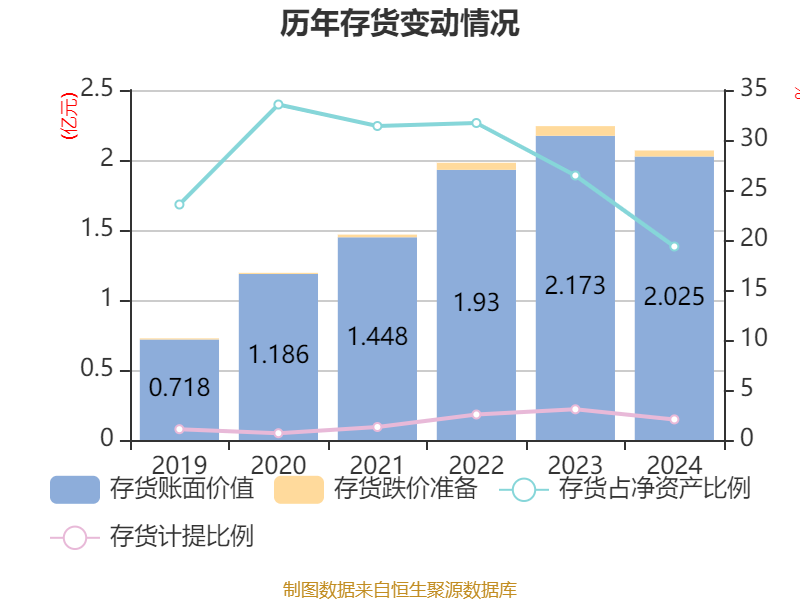 从存货变动来看,截至2024年末,公司存货账面价值为2.03亿元,占净资产的19.35%,较上年末减少1479.3万元。其中,存货跌价准备为425.45万元,计提比例为2.06%。
