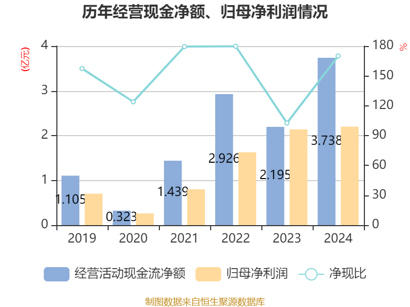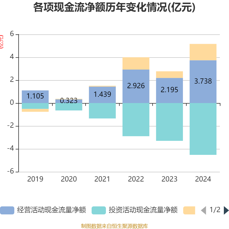 截至2024年,公司经营活动现金流净额为3.74亿元,同比增长70.33%;筹资活动现金流净额1.43亿元,同比增加8494.85万元;投资活动现金流净额-4.53亿元,上年同期为-3.3亿元。
