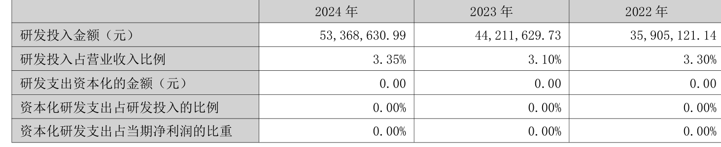 2024年全年,公司研发投入金额为5336.86万元,同比增长20.71%;研发投入占营业收入比例为3.35%,相比上年同期上升0.25个百分点。此外,公司全年研发投入资本化率为0%。
