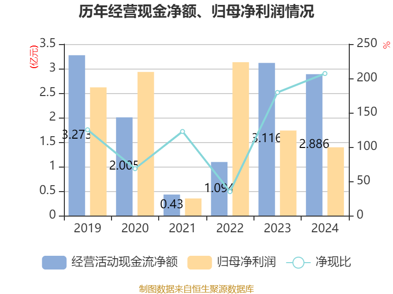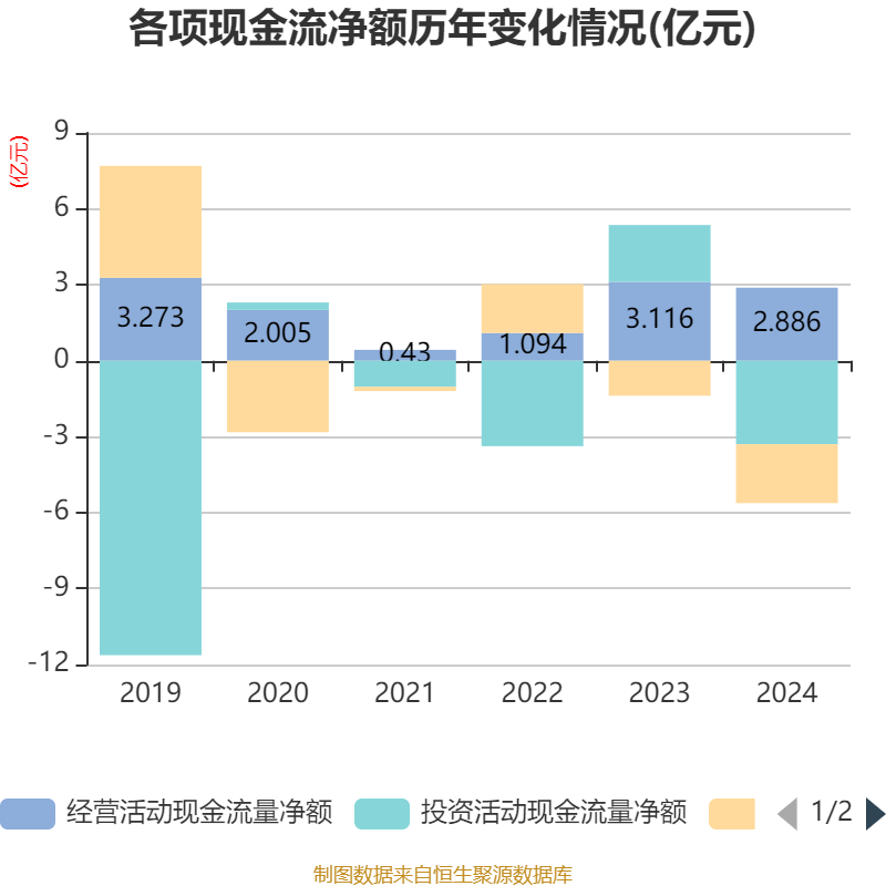 截至2024年,公司经营活动现金流净额为2.89亿元,同比下降7.36%;筹资活动现金流净额-2.33亿元,同比减少9429.18万元;投资活动现金流净额-3.3亿元,上年同期为2.25亿元。