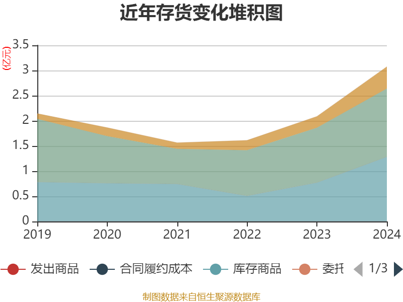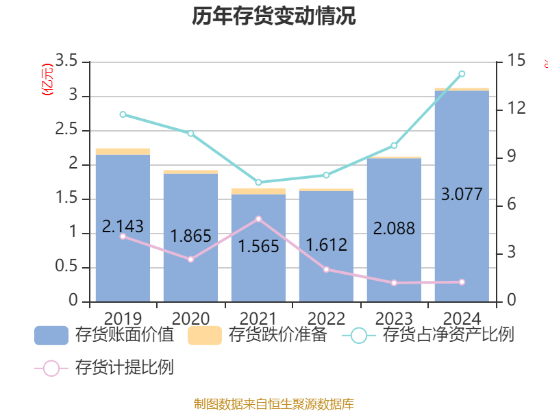 从存货变动来看,截至2024年末,公司存货账面价值为3.08亿元,占净资产的14.24%,较上年末增加9888.3万元。其中,存货跌价准备为376.56万元,计提比例为1.21%。