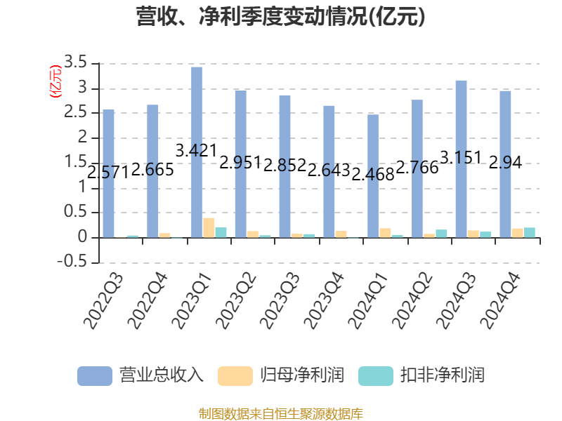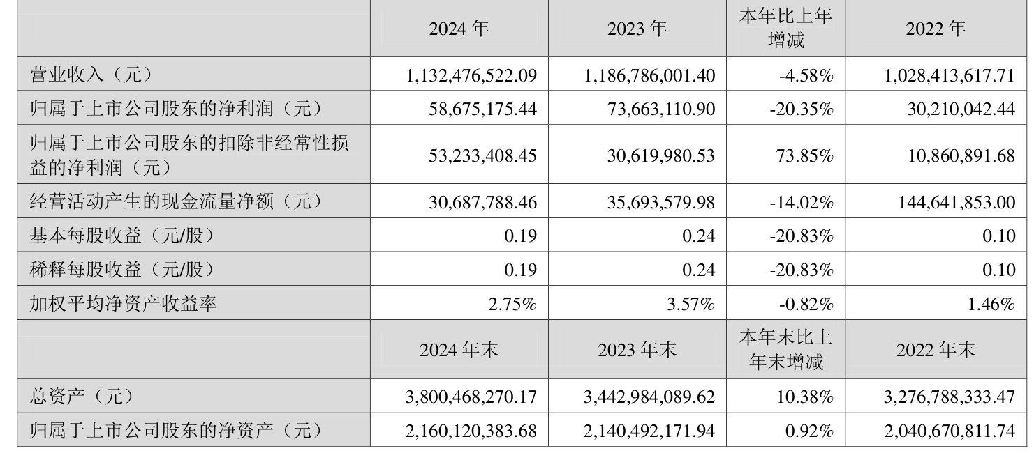 中证智能财讯哈三联(002900)4月25日披露2024年年度报告。2024年,公司实现营业总收入11.32亿元,同比下降4.58%;归母净利润5867.52万元,同比下降20.35%;扣非净利润5323.34万元,同比增长73.85%;经营活动产生的现金流量净额为3068.78万元,同比下降14.02%;报告期内,哈三联基本每股收益为0.19元,加权平均净资产收益率为2.75%。公司2024年度分配预案为:拟向全体股东每10股派现2元(含税)。