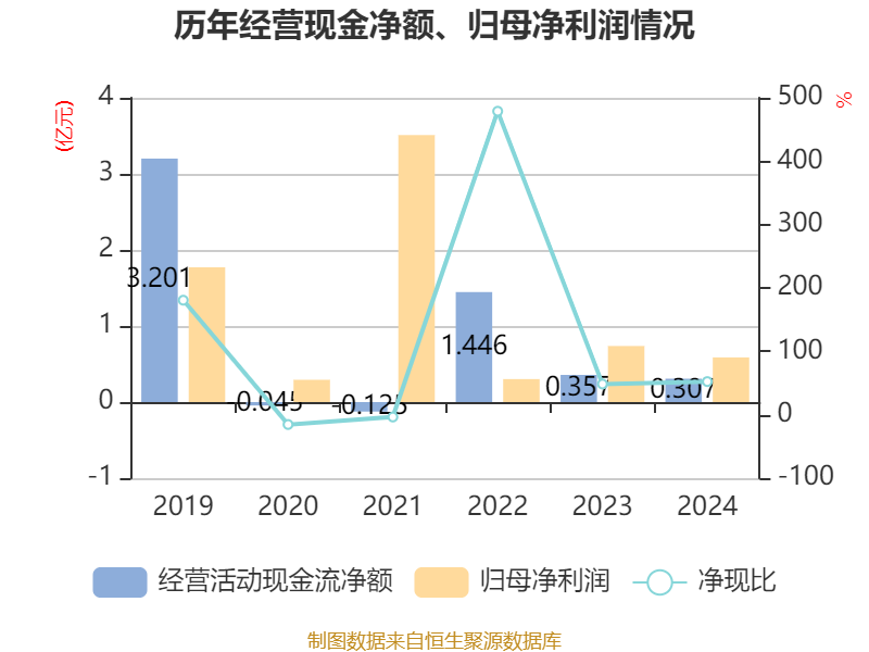 截至2024年,公司经营活动现金流净额为3068.78万元,同比下降14.02%;筹资活动现金流净额3.14亿元,同比增加3.29亿元;投资活动现金流净额-3.31亿元,上年同期为-2.61亿元。