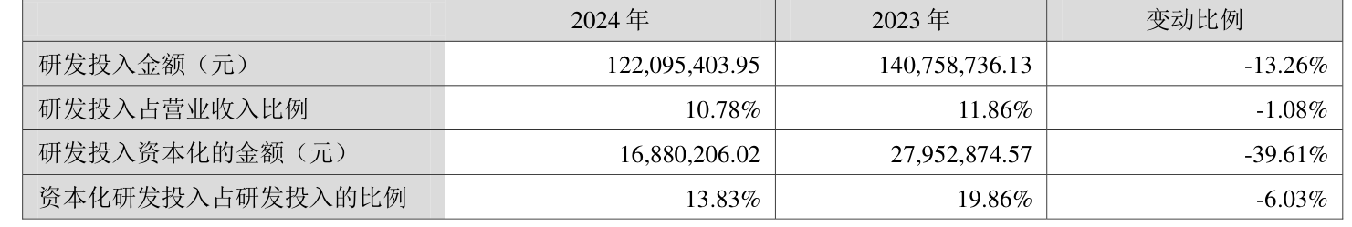 2024年全年,公司研发投入金额为1.22亿元,同比下降13.26%;研发投入占营业收入比例为10.78%,相比上年同期下降1.08个百分点。此外,公司全年研发投入资本化率为13.83%。