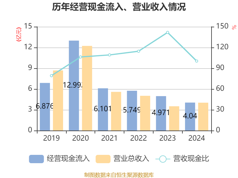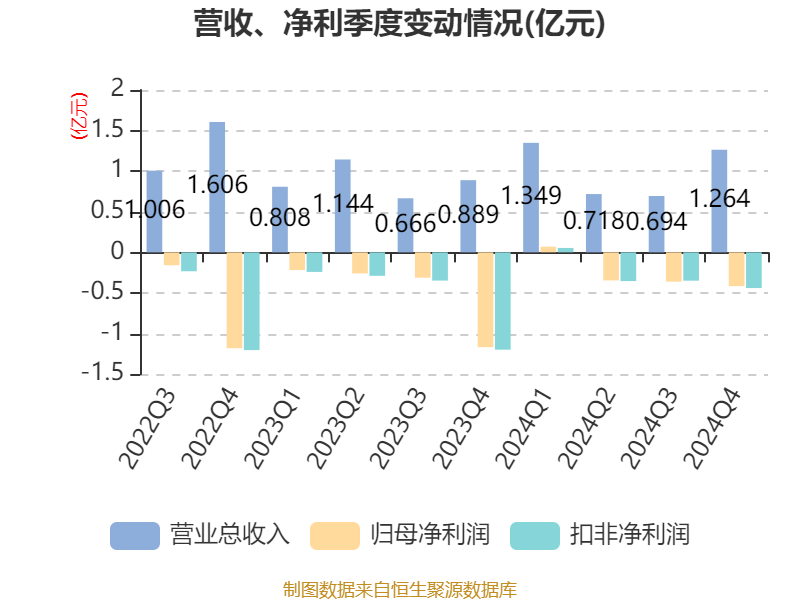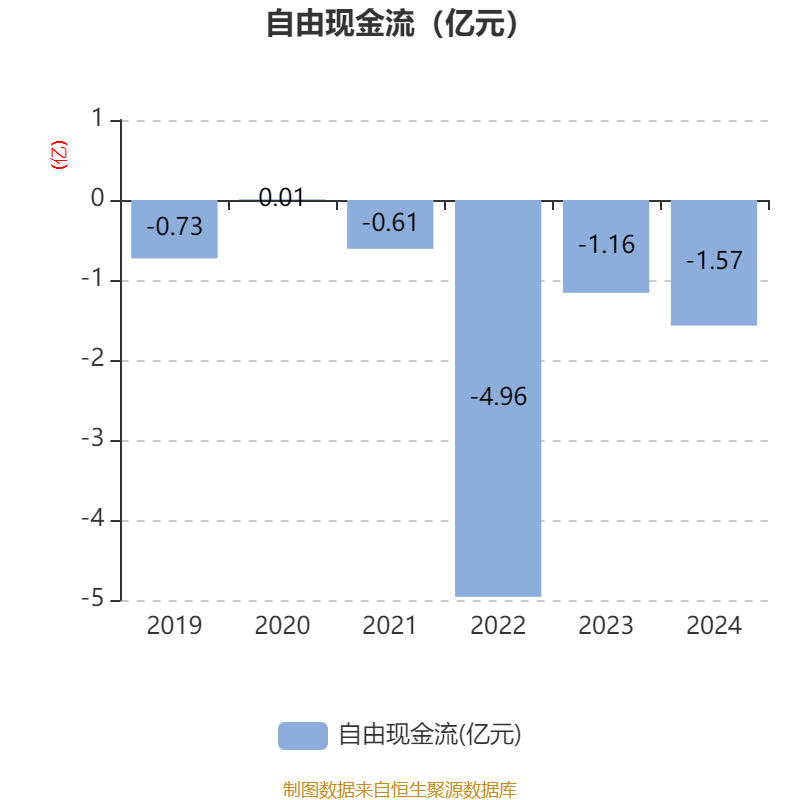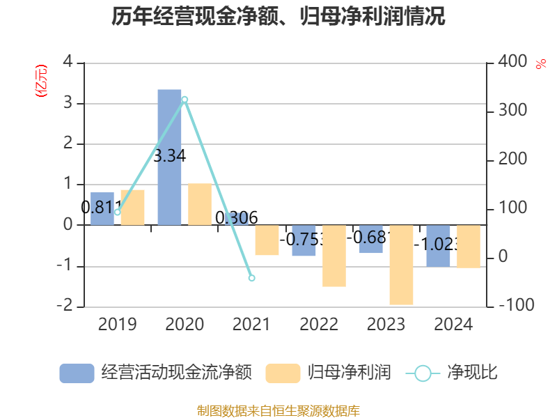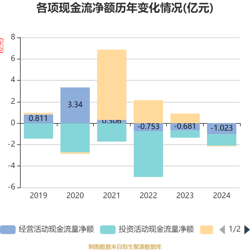截至2024年,公司经营活动现金流净额为-1.02亿元,同比减少3422.09万元;筹资活动现金流净额-702.58万元,同比减少9777.27万元;投资活动现金流净额-1.07亿元,上年同期为-6711.62万元。