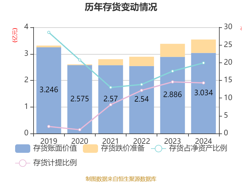 从存货变动来看,截至2024年末,公司存货账面价值为3.03亿元,占净资产的19.94%,较上年末增加1479.76万元。其中,存货跌价准备为5055.71万元,计提比例为14.29%。