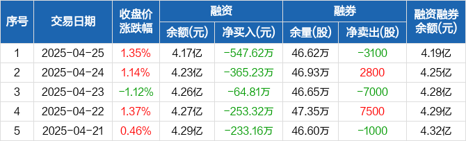 康恩贝融资融券信息显示,2025年4月25日融资净偿还547.62万元;融资余额4.17亿元,创近一年新低,较前一日下降1.3%。
