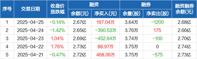 融资方面,当日融资买入827.47万元,融资偿还630.43万元,融资净买入197.04万元。融券方面,融券卖出0股,融券偿还1200股,融券余量3.64万股,融券余额100.63万元。融资融券余额合计2.68亿元。