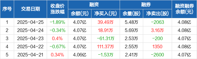 融资方面,当日融资买入796.44万元,融资偿还756.95万元,融资净买入39.49万元。融券方面,融券卖出200股,融券偿还2263股,融券余量5.48万股,融券余额79.86万元。融资融券余额合计4.08亿元。