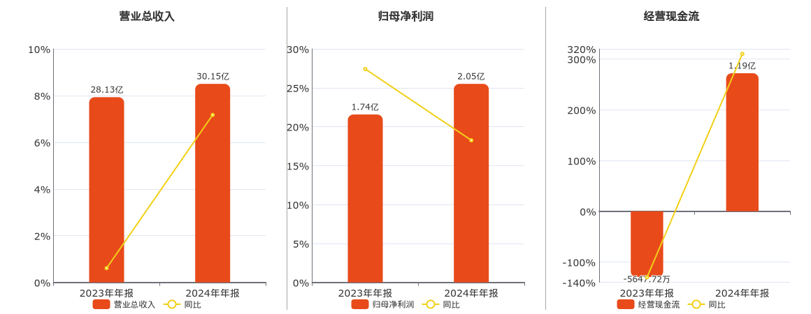 公司营业总收入为30.15亿元,较去年同报告期营业总收入增加2.02亿元,实现4年连续上涨,同比较去年同期上涨7.17%。归母净利润为2.05亿元,在已披露的同业公司中排名第27,较去年同报告期归母净利润增加3168.10万元,实现5年连续上涨,同比较去年同期上涨18.25%。经营活动现金净流入为1.19亿元,较去年同报告期经营活动现金净流入增加1.75亿元。