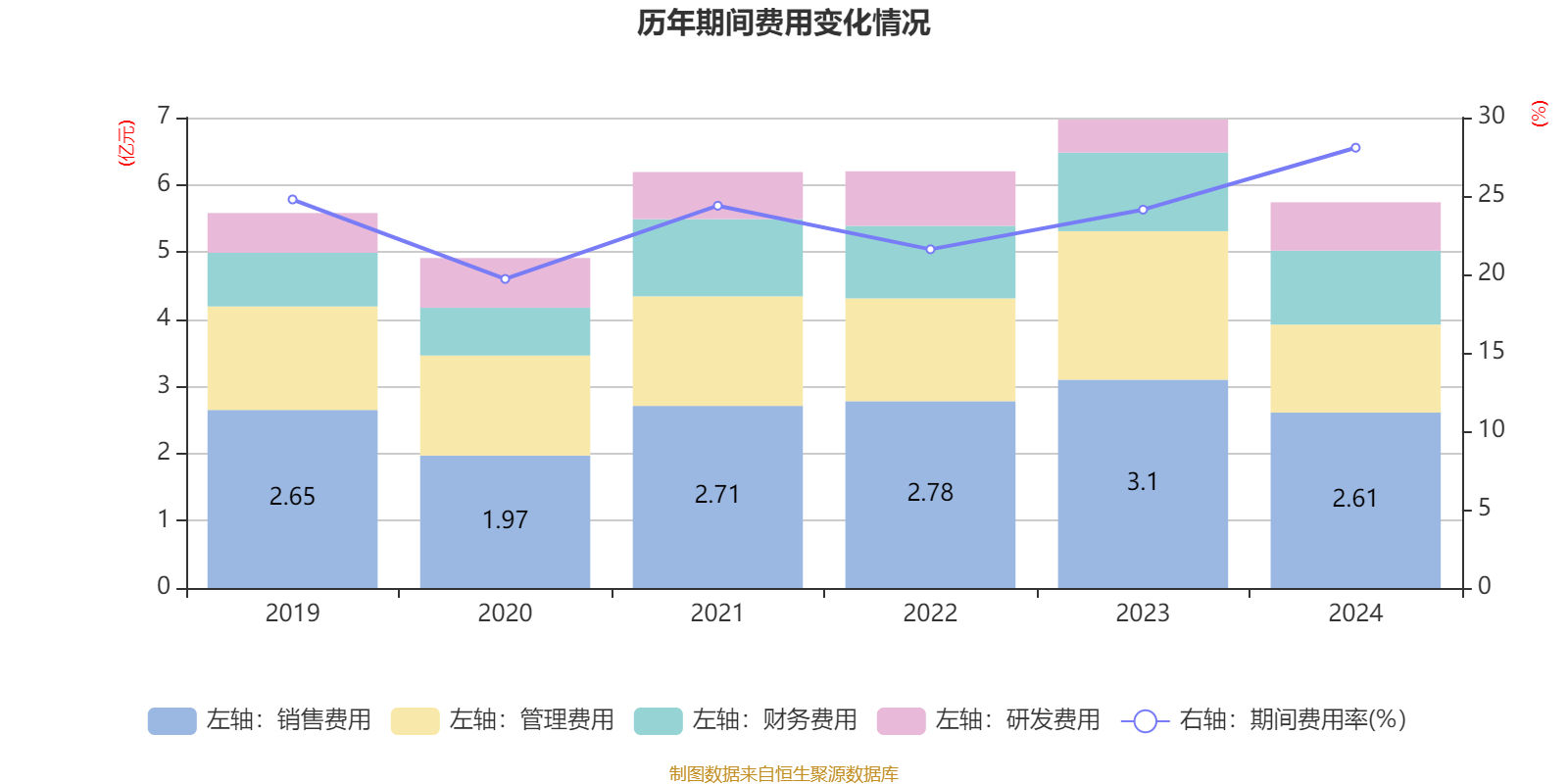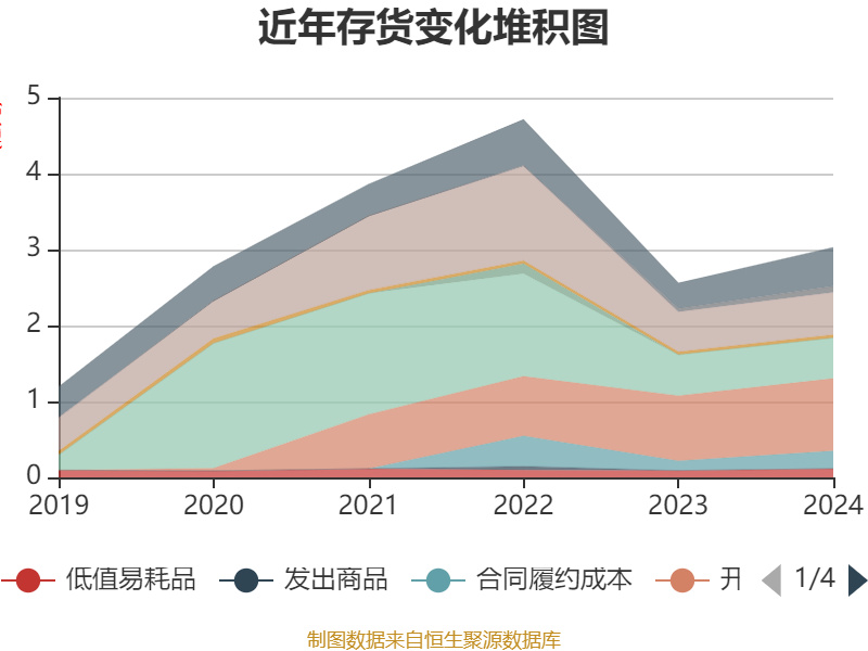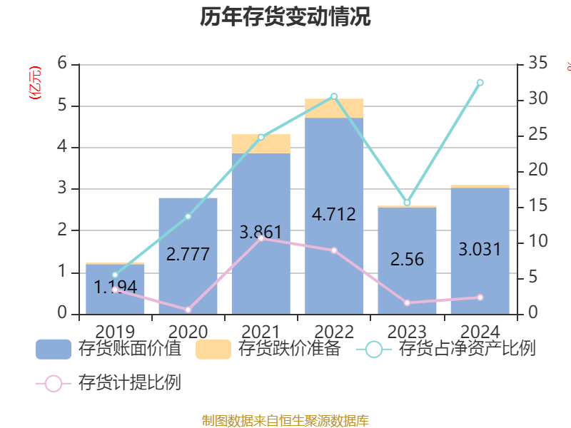 从存货变动来看,截至2024年末,公司存货账面价值为3.03亿元,占净资产的32.43%,较上年末增加4706.47万元。其中,存货跌价准备为717.2万元,计提比例为2.31%。