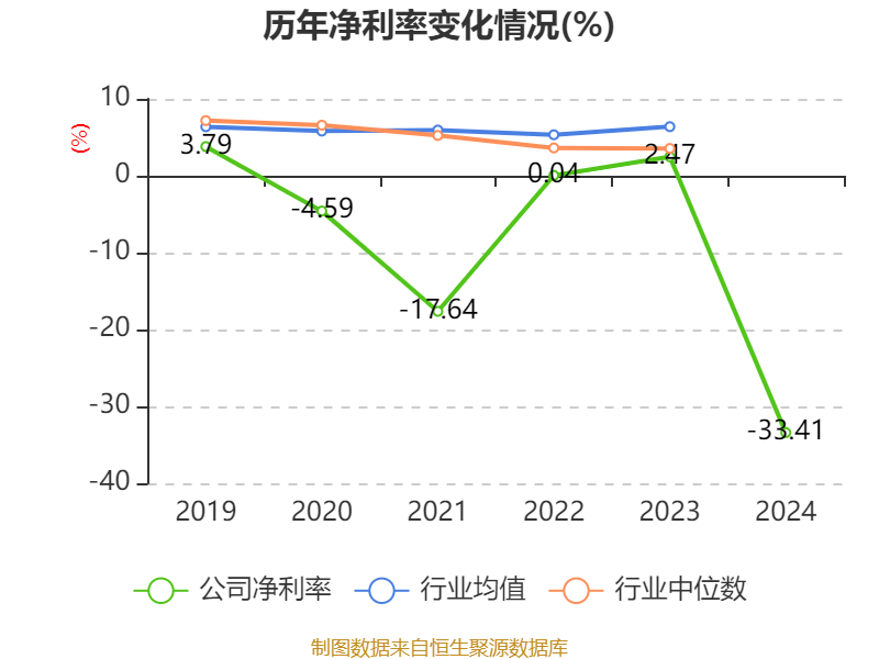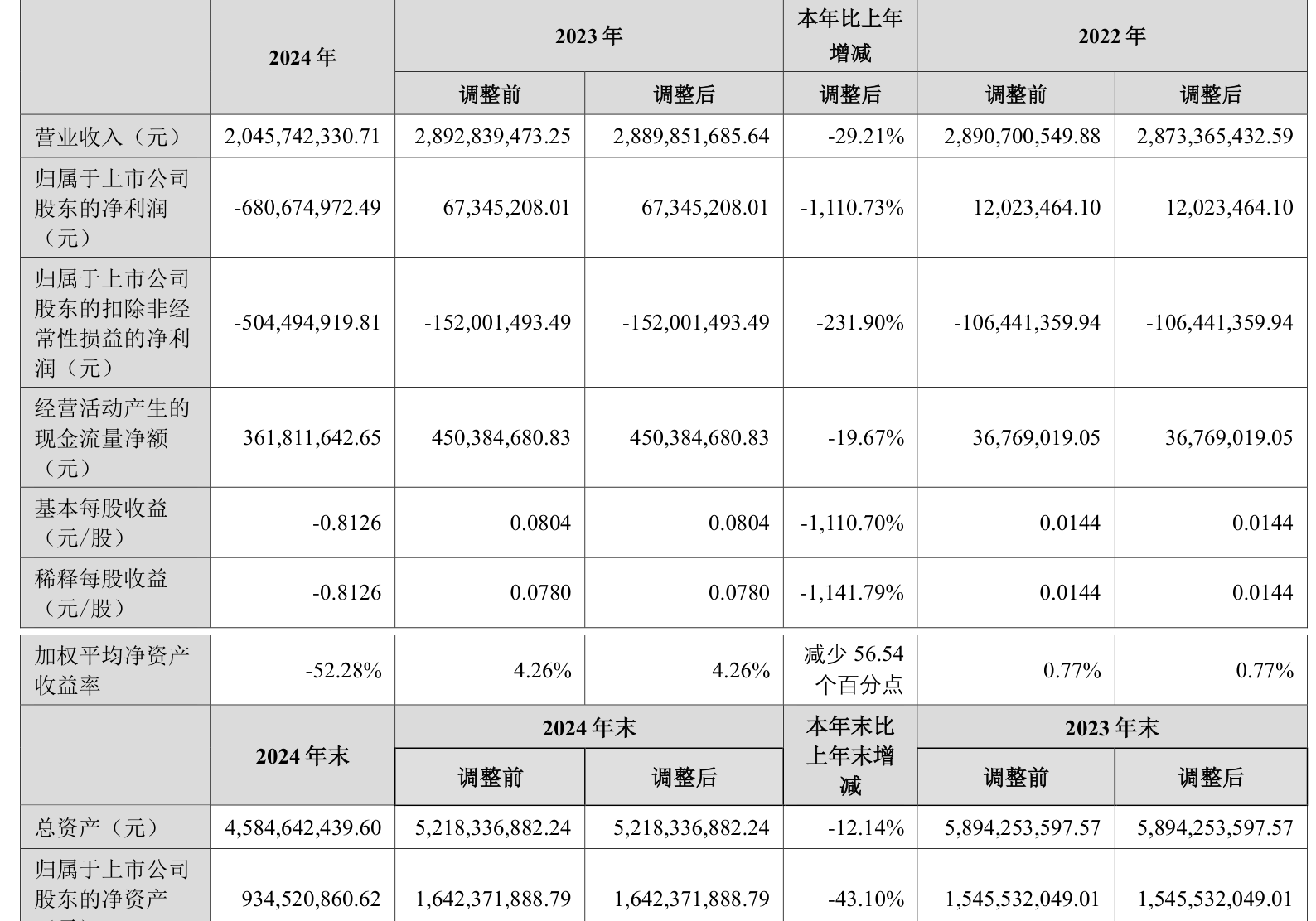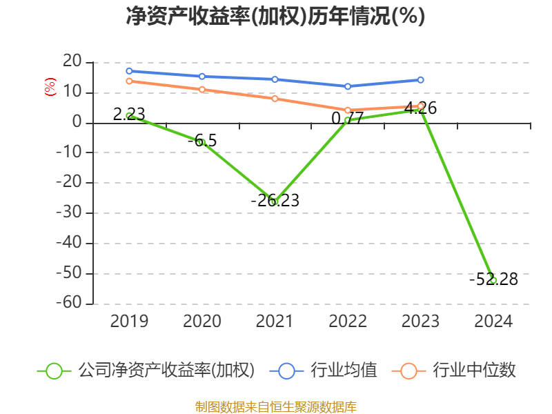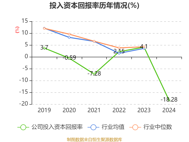 数据显示,2024年公司加权平均净资产收益率为-52.28%,较上年同期下降56.54个百分点。公司2024年投入资本回报率为-18.28%,较上年同期下降22.38个百分点。