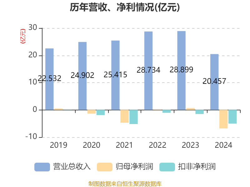 中证智能财讯皇氏集团(002329)4月25日披露2024年年度报告。2024年,公司实现营业总收入20.46亿元,同比下降29.21%;归母净利润亏损6.81亿元,上年同期盈利6734.52万元;扣非净利润亏损5.04亿元,上年同期亏损1.52亿元;经营活动产生的现金流量净额为3.62亿元,同比下降19.67%;报告期内,皇氏集团基本每股收益为-0.8126元,加权平均净资产收益率为-52.28%。