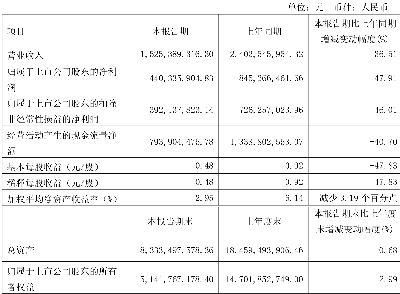 中证智能财讯济川药业(600566)4月26日披露2025年第一季度报告。公司实现营业总收入15.25亿元,同比下降36.51%;归母净利润4.4亿元,同比下降47.91%;扣非净利润3.92亿元,同比下降46.01%;经营活动产生的现金流量净额为7.94亿元,同比下降40.70%;报告期内,济川药业基本每股收益为0.48元,加权平均净资产收益率为2.95%。