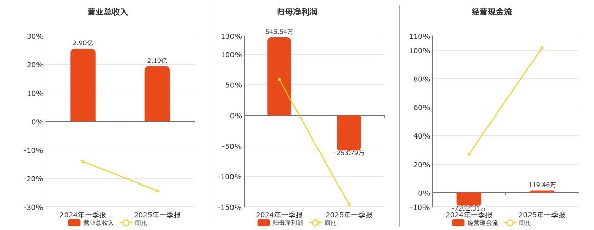 公司营业总收入为2.19亿元,较去年同报告期营业总收入减少7064.89万元,同比较去年同期下降24.39%。归母净利润为-253.79万元,较去年同报告期归母净利润减少799.32万元,同比较去年同期下降146.52%。经营活动现金净流入为119.46万元。