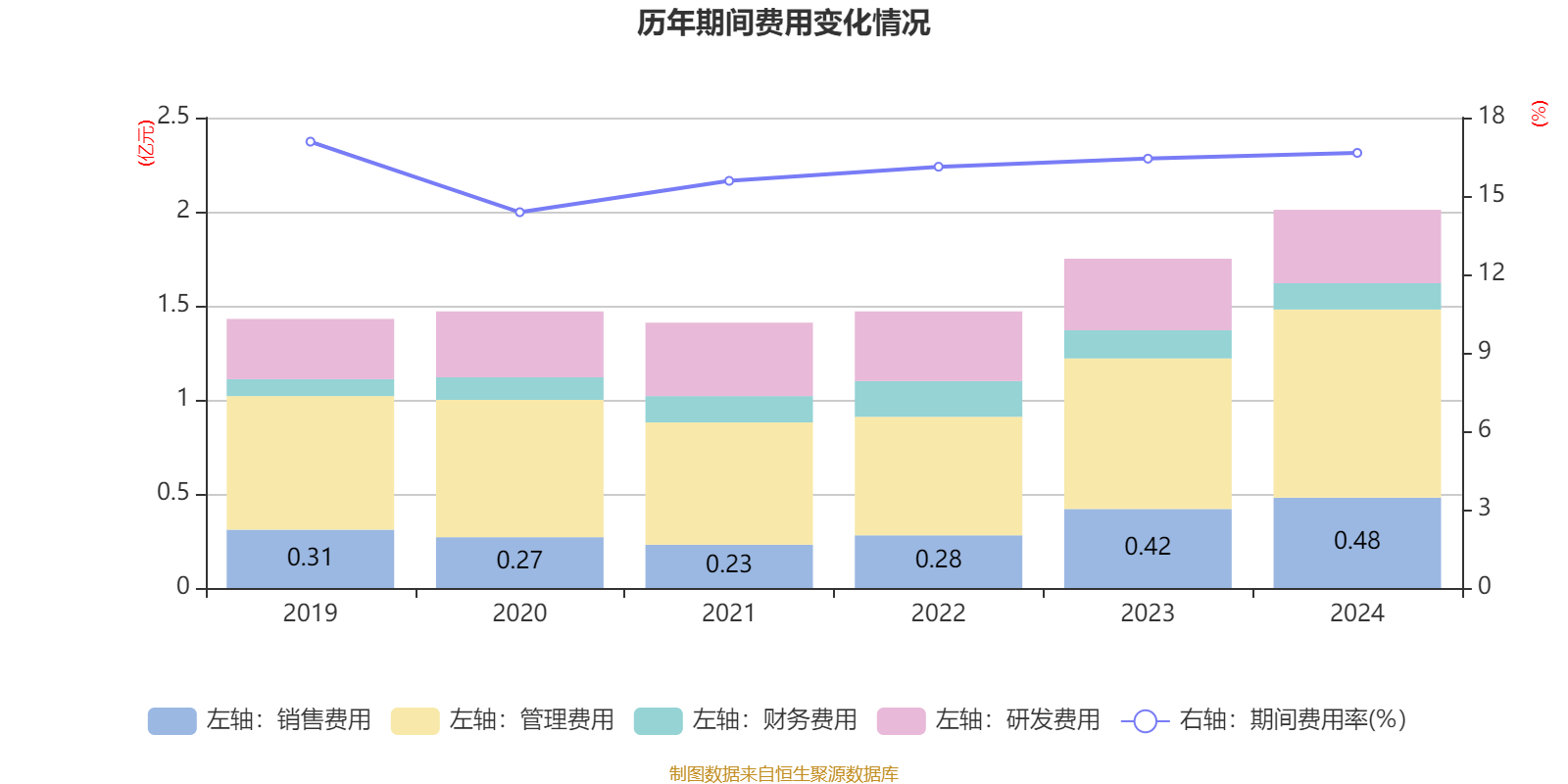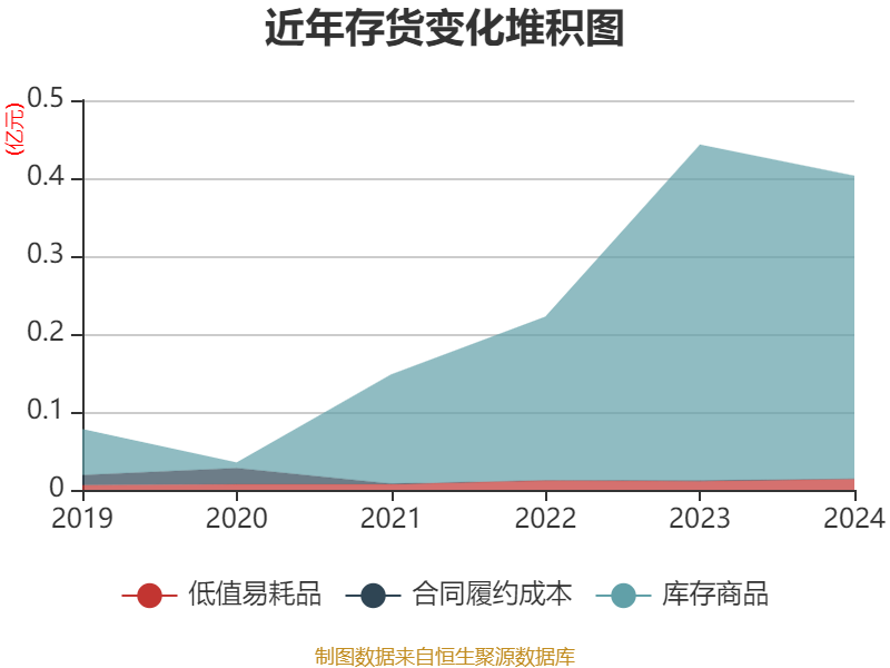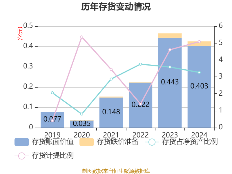 从存货变动来看,截至2024年末,公司存货账面价值为4032.75万元,占净资产的3.26%,较上年末减少393.16万元。其中,存货跌价准备为216.01万元,计提比例为5.08%。