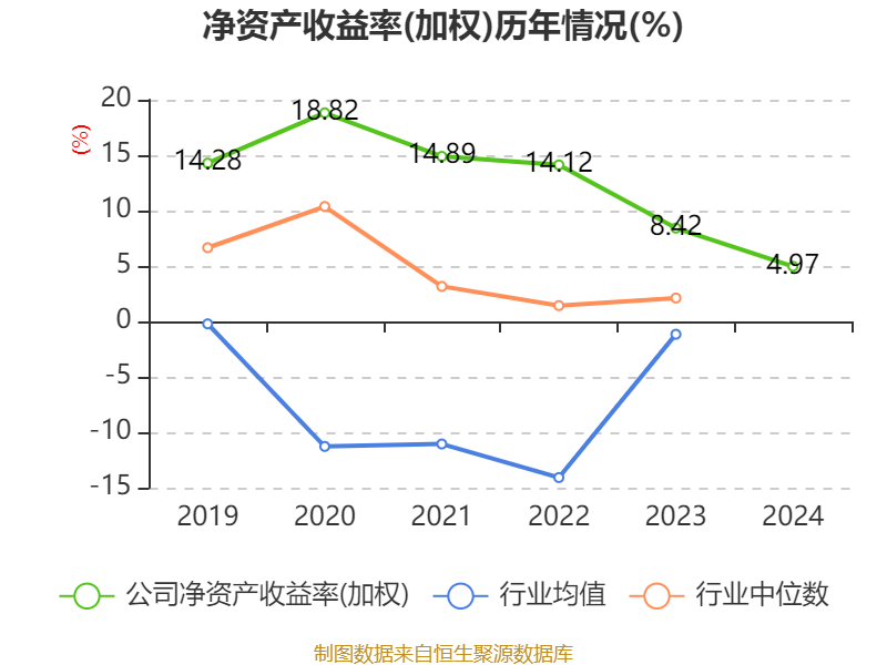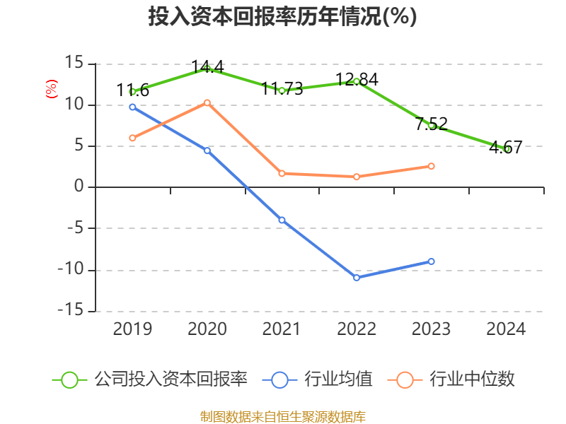 数据显示,2024年公司加权平均净资产收益率为4.97%,较上年同期下降3.45个百分点。公司2024年投入资本回报率为4.67%,较上年同期下降2.85个百分点。
