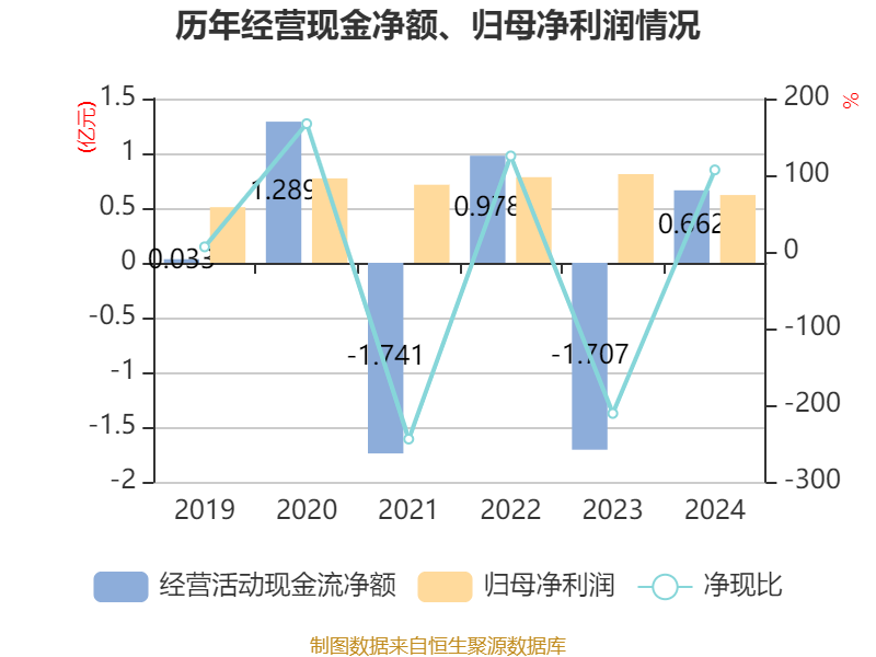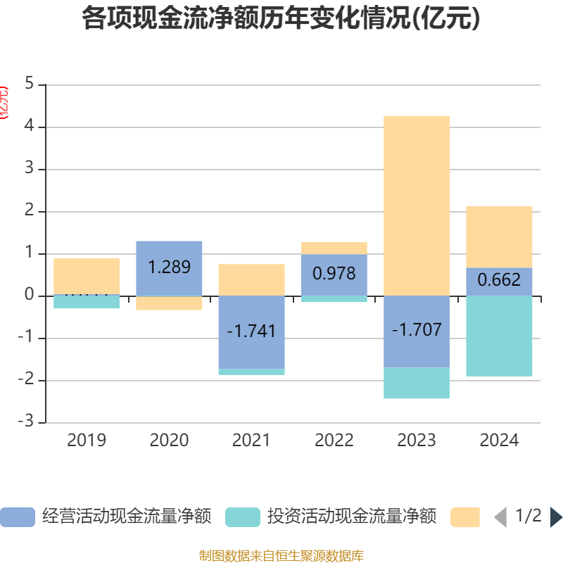 截至2024年,公司经营活动现金流净额为6617.63万元,同比增加2.37亿元;筹资活动现金流净额1.45亿元,同比减少2.8亿元;投资活动现金流净额-1.91亿元,上年同期为-7300.5万元。