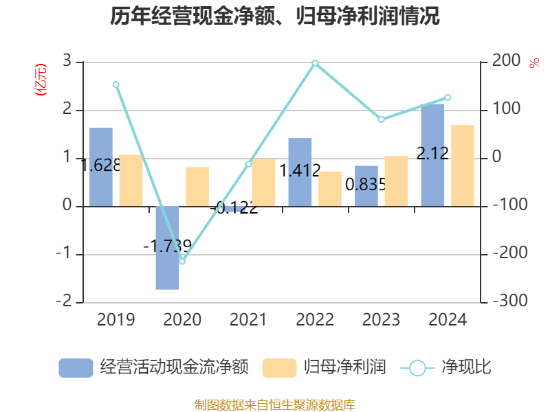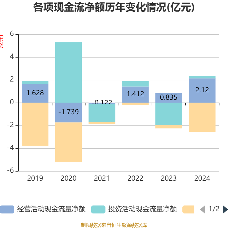 截至2024年,公司经营活动现金流净额为2.12亿元,同比增长153.94%;筹资活动现金流净额-2.56亿元,同比减少2.28亿元;投资活动现金流净额2106.91万元,上年同期为-1.98亿元。