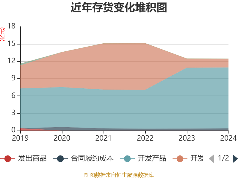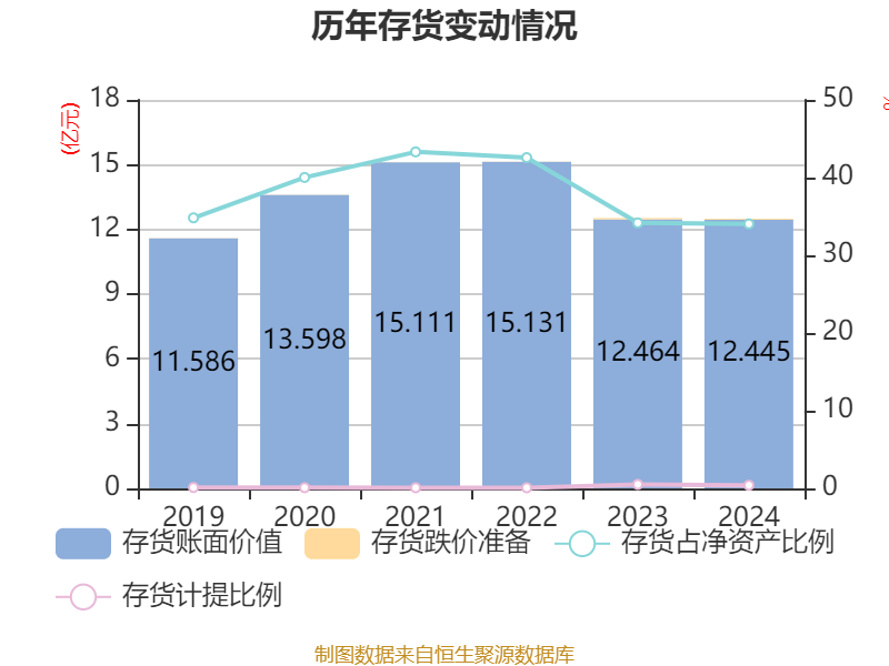 从存货变动来看,截至2024年末,公司存货账面价值为12.44亿元,占净资产的34.04%,较上年末减少195.37万元。其中,存货跌价准备为494.27万元,计提比例为0.4%。