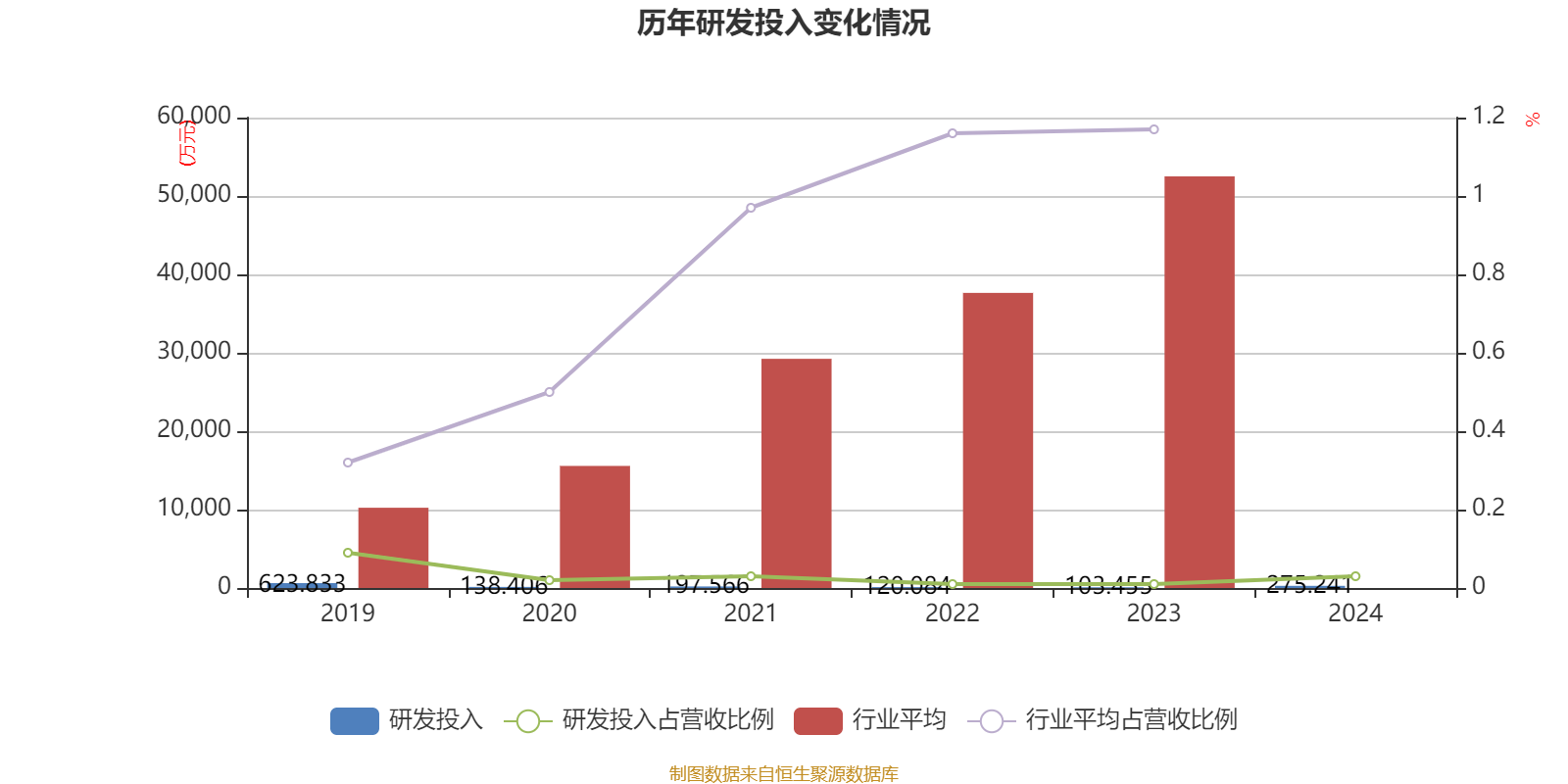 2024年全年,公司研发投入金额为275.24万元,同比增长166.05%;研发投入占营业收入比例为0.03%,相比上年同期上升0.02个百分点。此外,公司全年研发投入资本化率为0%。