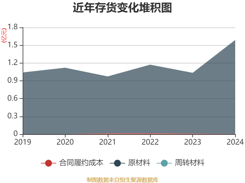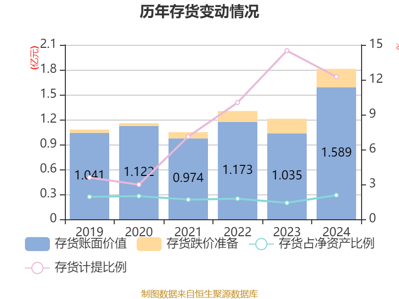 从存货变动来看,截至2024年末,公司存货账面价值为1.59亿元,占净资产的2.07%,较上年末增加5537.75万元。其中,存货跌价准备为2220.7万元,计提比例为12.26%。