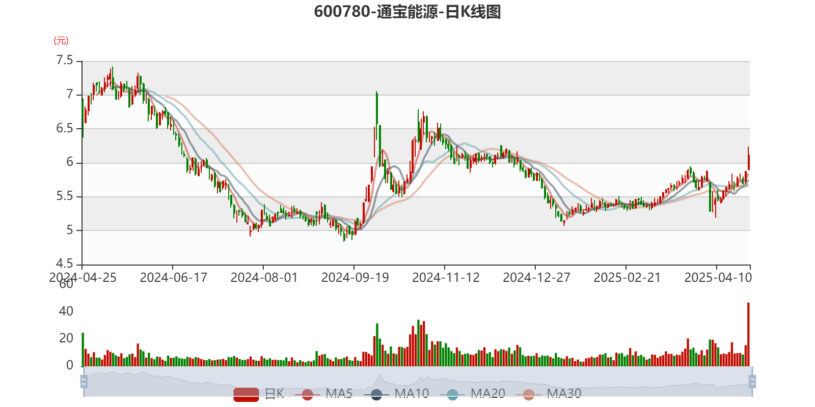 以4月24日收盘价计算,通宝能源目前市盈率(TTM)约为13.13倍,市净率(LF)约0.87倍,市销率(TTM)约0.62倍。