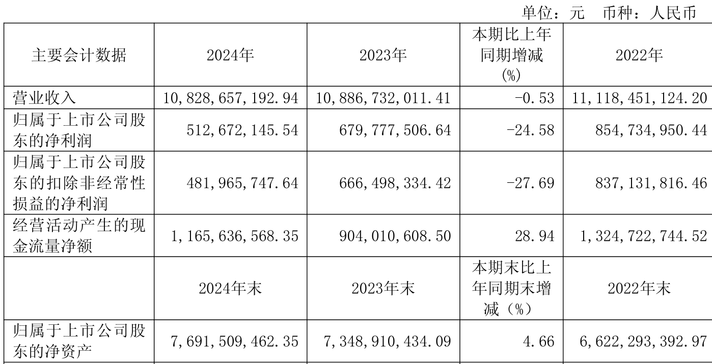 中证智能财讯通宝能源(600780)4月25日披露2024年年度报告。2024年,公司实现营业总收入108.29亿元,同比下降0.53%;归母净利润5.13亿元,同比下降24.58%;扣非净利润4.82亿元,同比下降27.69%;经营活动产生的现金流量净额为11.66亿元,同比增长28.94%;报告期内,通宝能源基本每股收益为0.4472元,加权平均净资产收益率为6.82%。