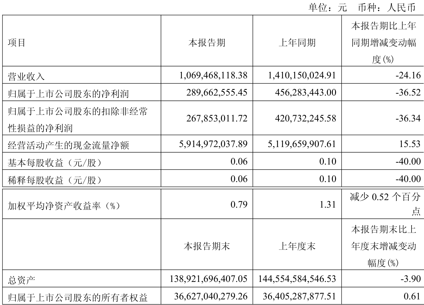 中证智能财讯财通证券(601108)4月26日披露2025年第一季度报告。公司实现营业总收入10.69亿元,同比下降24.16%;归母净利润2.9亿元,同比下降36.52%;扣非净利润2.68亿元,同比下降36.34%;经营活动产生的现金流量净额为59.15亿元,同比增长15.53%;报告期内,财通证券基本每股收益为0.06元,加权平均净资产收益率为0.79%。