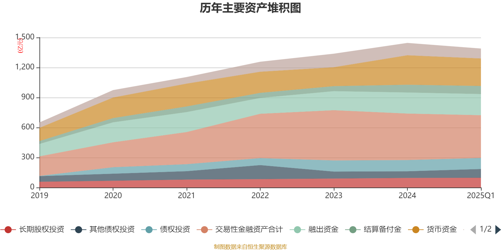 资产重大变化方面,截至2025年一季度末,公司其他债权投资较上年末增加33.27%,占公司总资产比重上升1.76个百分点;交易性金融资产合计较上年末减少8.09%,占公司总资产比重下降1.4个百分点;买入返售金融资产较上年末减少33.69%,占公司总资产比重下降1.13个百分点;融出资金较上年末增加0.21%,占公司总资产比重上升0.62个百分点。