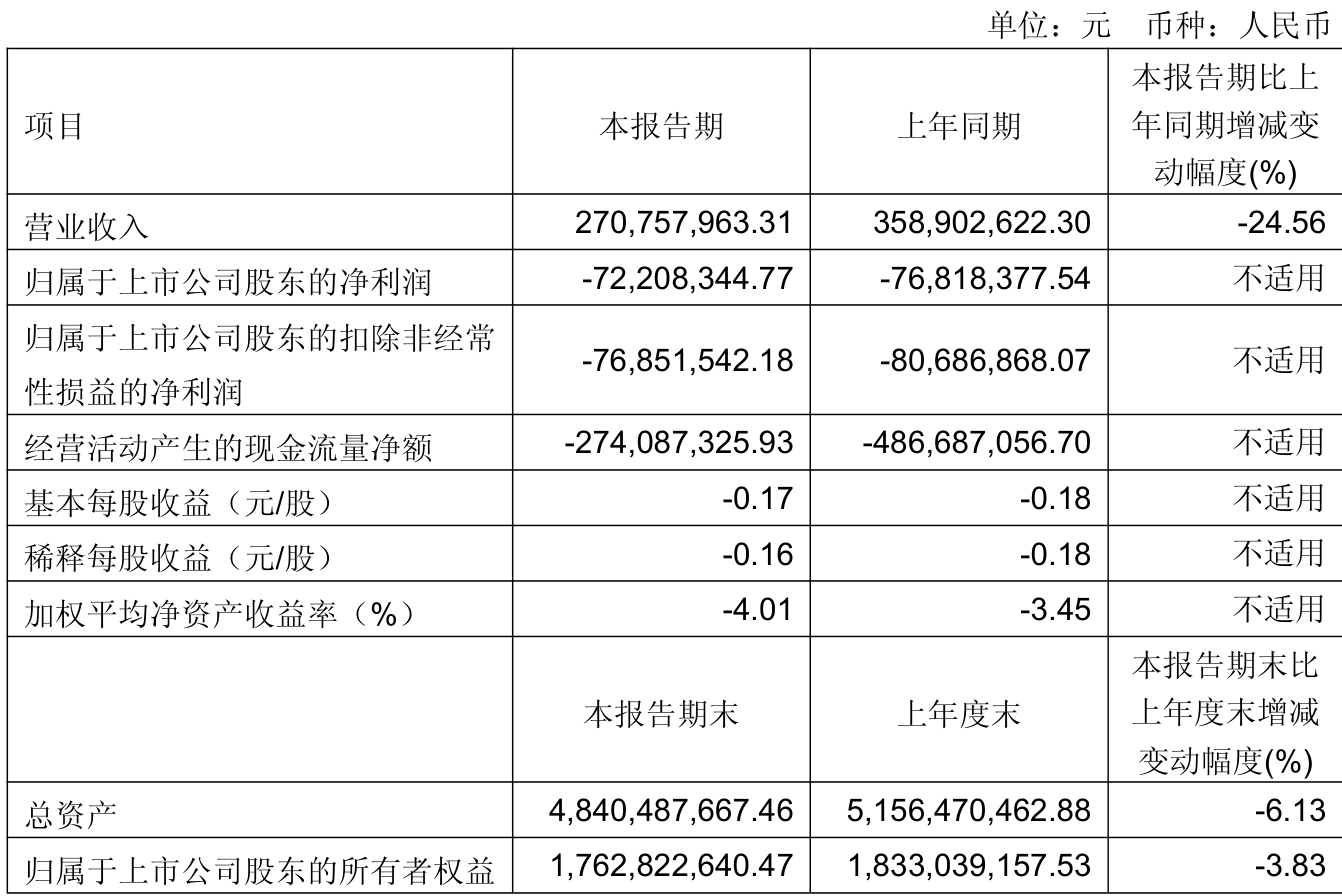 中证智能财讯航天晨光(600501)4月26日披露2025年第一季度报告。公司实现营业总收入2.71亿元,同比下降24.56%;归母净利润亏损7220.83万元,上年同期亏损7681.84万元;扣非净利润亏损7685.15万元,上年同期亏损8068.69万元;经营活动产生的现金流量净额为-2.74亿元,上年同期为-4.87亿元;报告期内,航天晨光基本每股收益为-0.17元,加权平均净资产收益率为-4.01%。