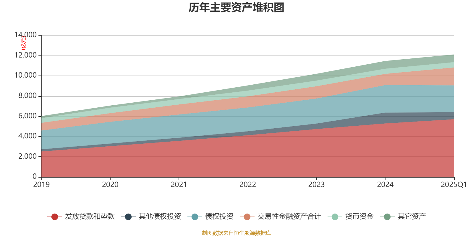 资产重大变化方面,截至2025年一季度末,公司交易性金融资产合计较上年末增加60.35%,占公司总资产比重上升4.99个百分点;其他债权投资较上年末减少36.15%,占公司总资产比重下降3.69个百分点;债权投资较上年末减少2.26%,占公司总资产比重下降1.77个百分点;发放贷款和垫款较上年末增加7.88%,占公司总资产比重上升0.99个百分点。