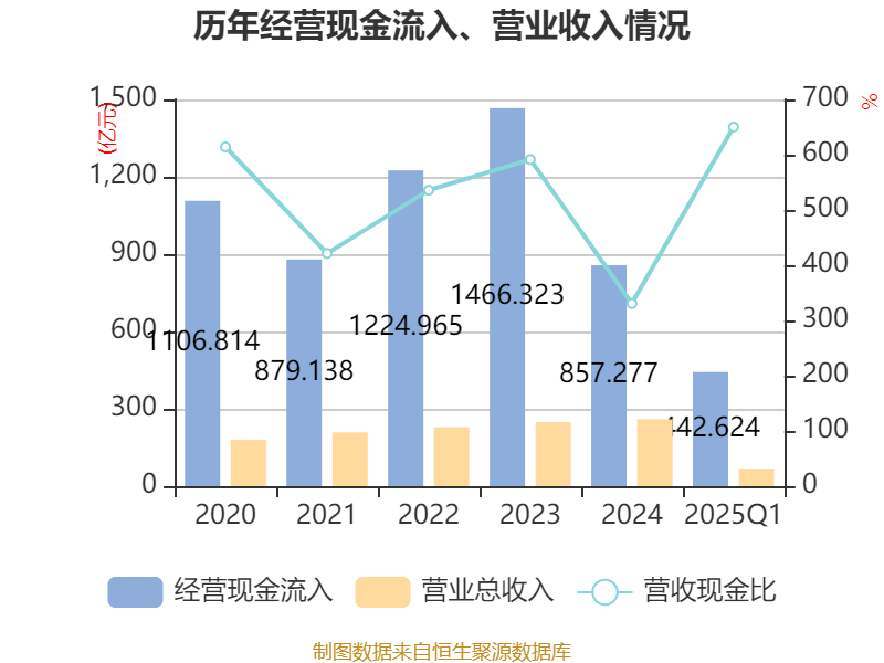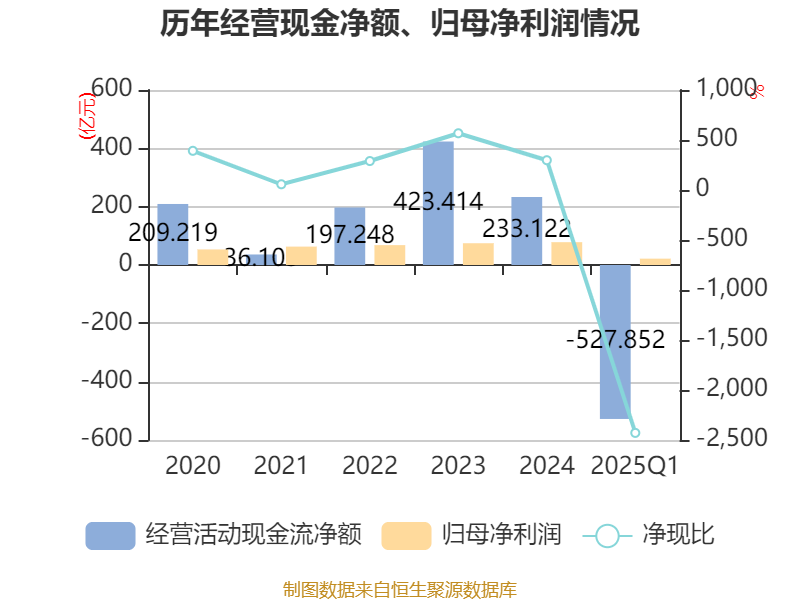 截至2025年一季度末,公司经营活动现金流净额为-527.85亿元,同比减少290.71亿元;筹资活动现金流净额90.79亿元,同比减少183.79亿元;投资活动现金流净额460.17亿元,上年同期为-38.04亿元。