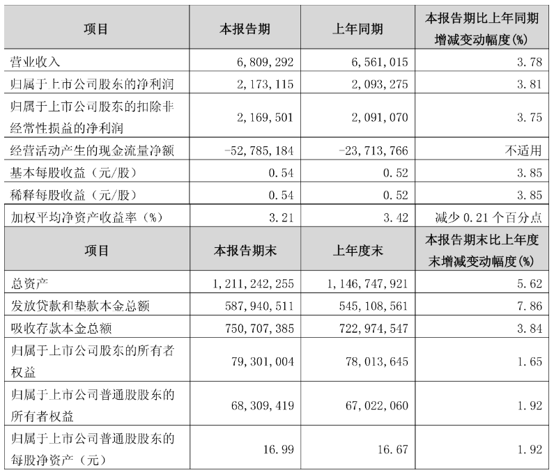 中证智能财讯长沙银行(601577)4月26日披露2025年第一季度报告。公司实现营业总收入68.09亿元,同比增长3.78%;归母净利润21.73亿元,同比增长3.81%;扣非净利润21.7亿元,同比增长3.75%;经营活动产生的现金流量净额为-527.85亿元,上年同期为-237.14亿元;报告期内,长沙银行基本每股收益为0.54元,加权平均净资产收益率为3.21%。