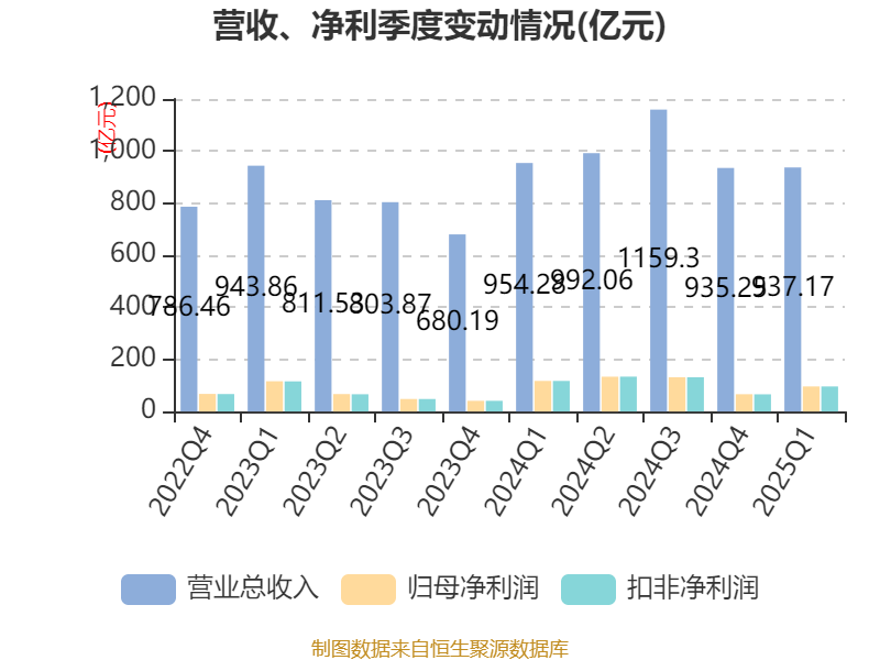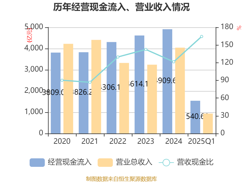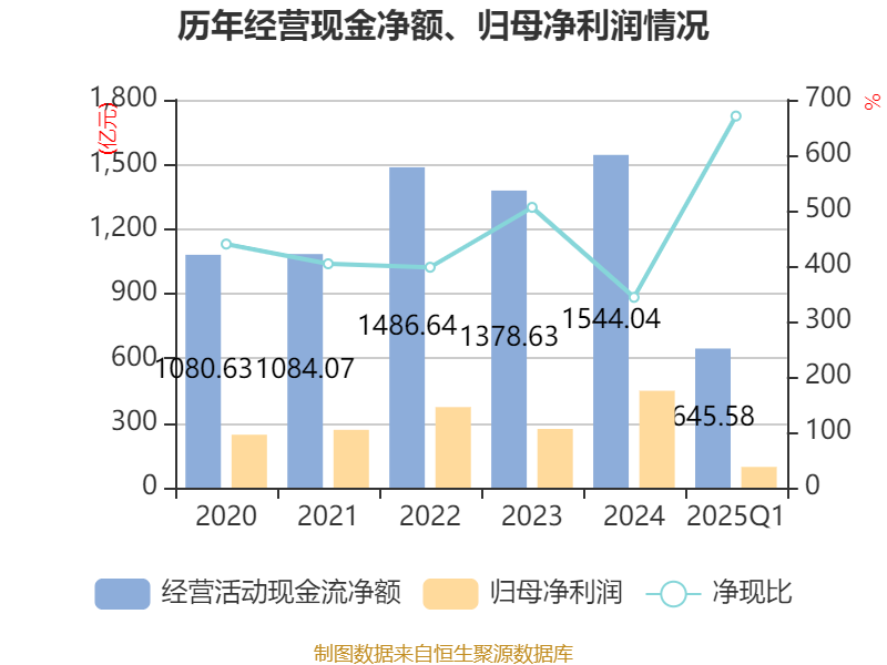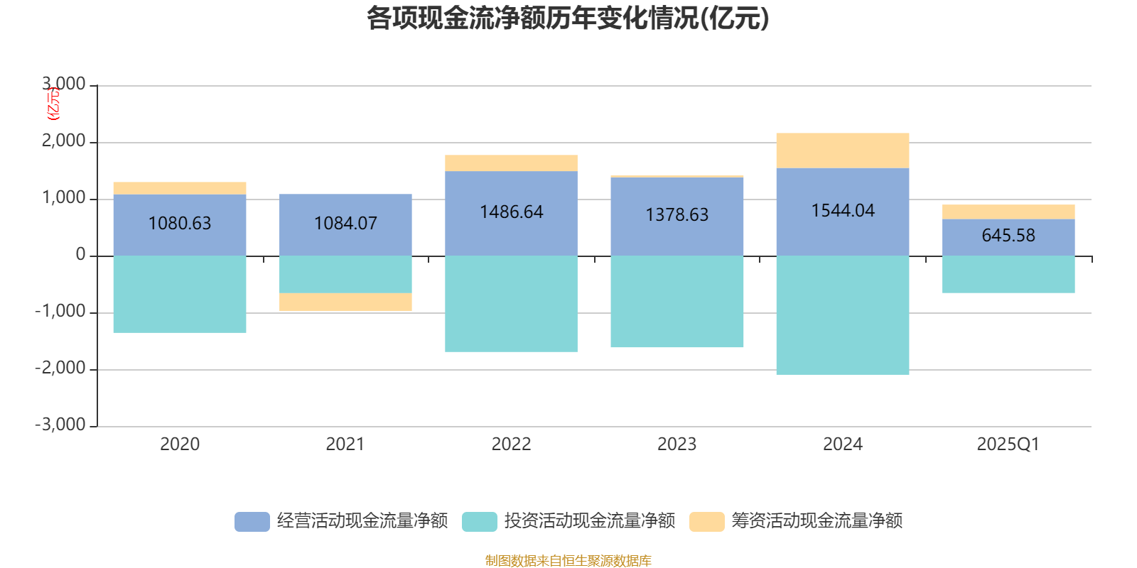 截至2025年一季度末,公司经营活动现金流净额为645.58亿元,同比增长29.41%;筹资活动现金流净额252.82亿元,同比增加530.03亿元;投资活动现金流净额-658.43亿元,上年同期为6.17亿元。