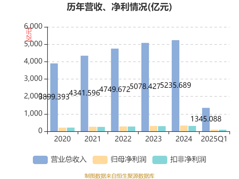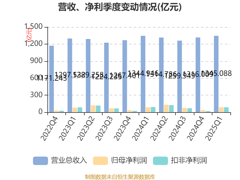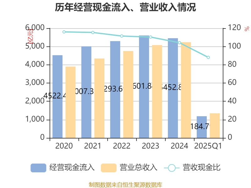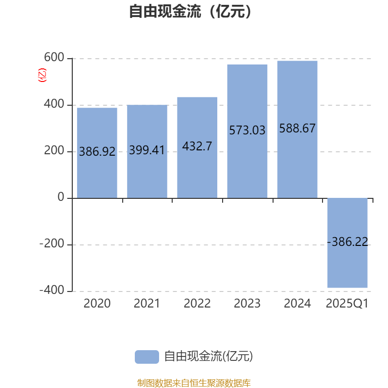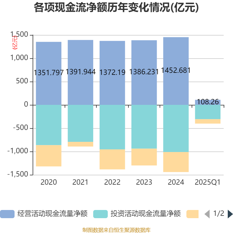 截至2025年一季度末,公司经营活动现金流净额为108.26亿元,同比下降48.11%;筹资活动现金流净额-94.37亿元,同比增加6.93亿元;投资活动现金流净额-307.88亿元,上年同期为-202.29亿元。