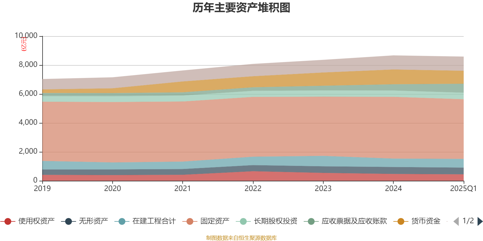 资产重大变化方面,截至2025年一季度末,公司应收票据及应收账款较上年末增加44.89%,占公司总资产比重上升2.29个百分点;货币资金较上年末减少11.98%,占公司总资产比重下降1.31个百分点;固定资产较上年末减少3.3%,占公司总资产比重下降1.17个百分点;在建工程合计较上年末增加3.4%,占公司总资产比重上升0.3个百分点。