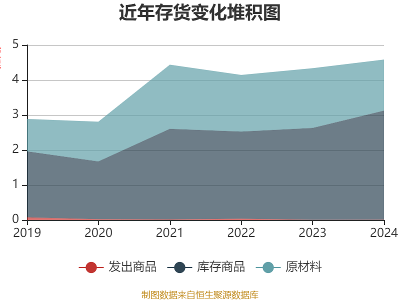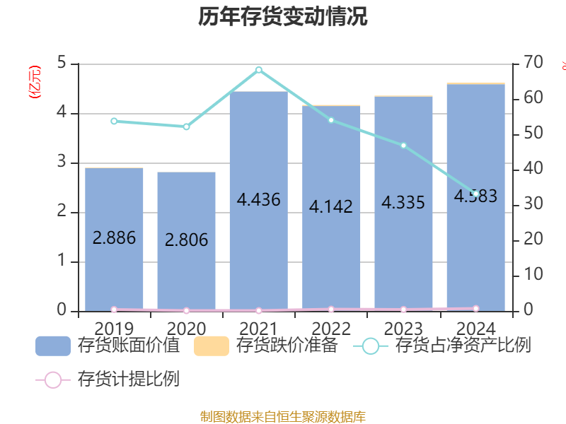 从存货变动来看,截至2024年末,公司存货账面价值为4.58亿元,占净资产的33.17%,较上年末增加2482.02万元。其中,存货跌价准备为320.65万元,计提比例为0.69%。