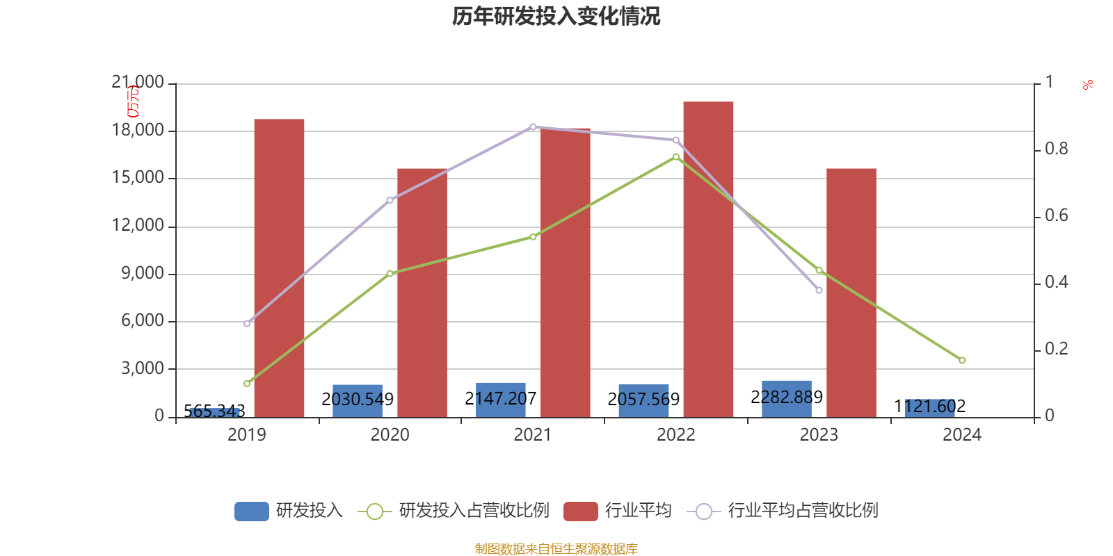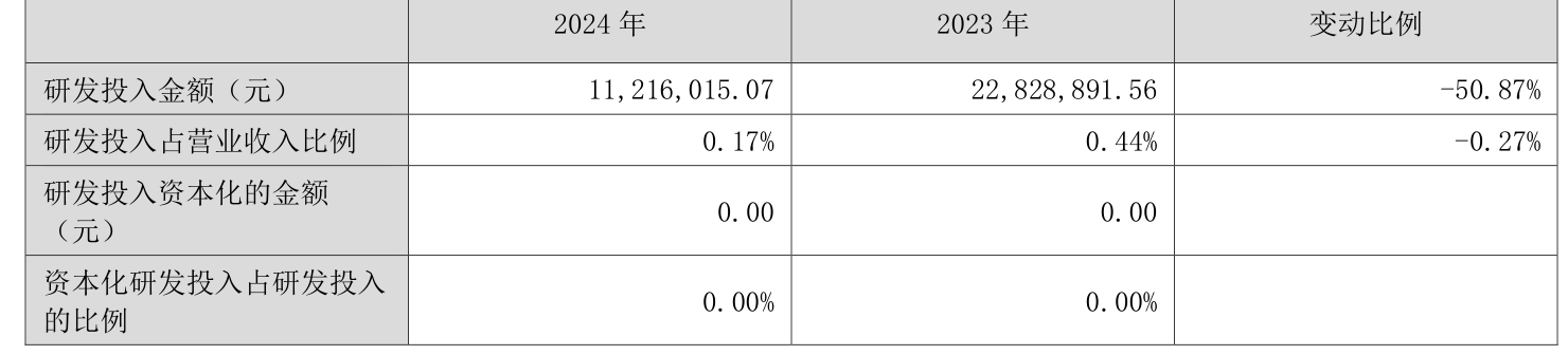 2024年全年,公司研发投入金额为1121.6万元,同比下降50.87%;研发投入占营业收入比例为0.17%,相比上年同期下降0.27个百分点。此外,公司全年研发投入资本化率为0。