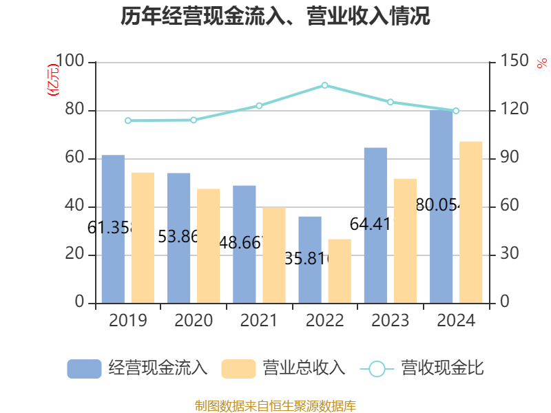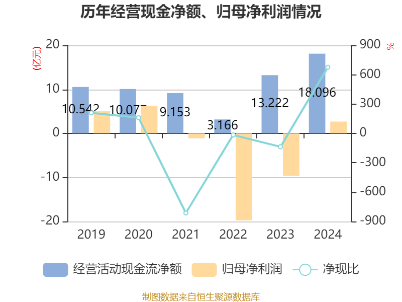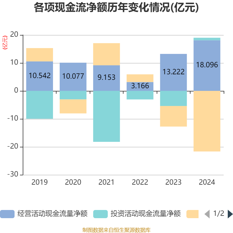 截至2024年,公司经营活动现金流净额为18.1亿元,同比增长36.87%;筹资活动现金流净额-21.68亿元,同比减少14.32亿元;投资活动现金流净额9048.66万元,上年同期为-5.41亿元。