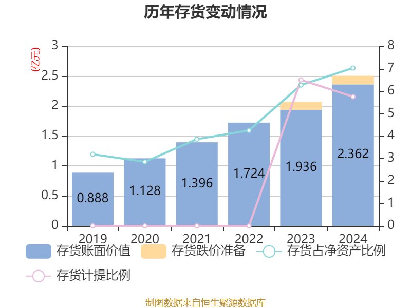 从存货变动来看,截至2024年末,公司存货账面价值为2.36亿元,占净资产的7.03%,较上年末增加4256.07万元。其中,存货跌价准备为1441.03万元,计提比例为5.75%。