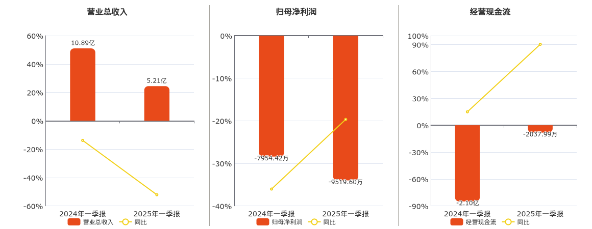 公司营业总收入为5.21亿元,较去年同报告期营业总收入减少5.68亿元,同比较去年同期下降52.13%。归母净利润为-9519.60万元,较去年同报告期归母净利润减少1565.17万元。经营活动现金净流入为-2037.99万元。