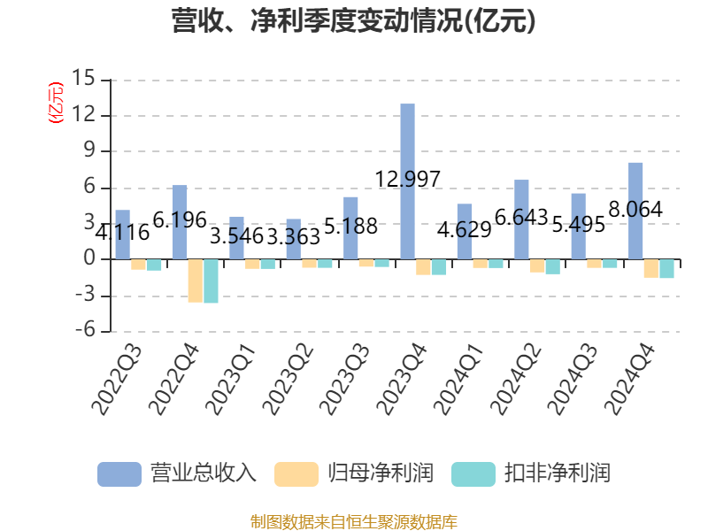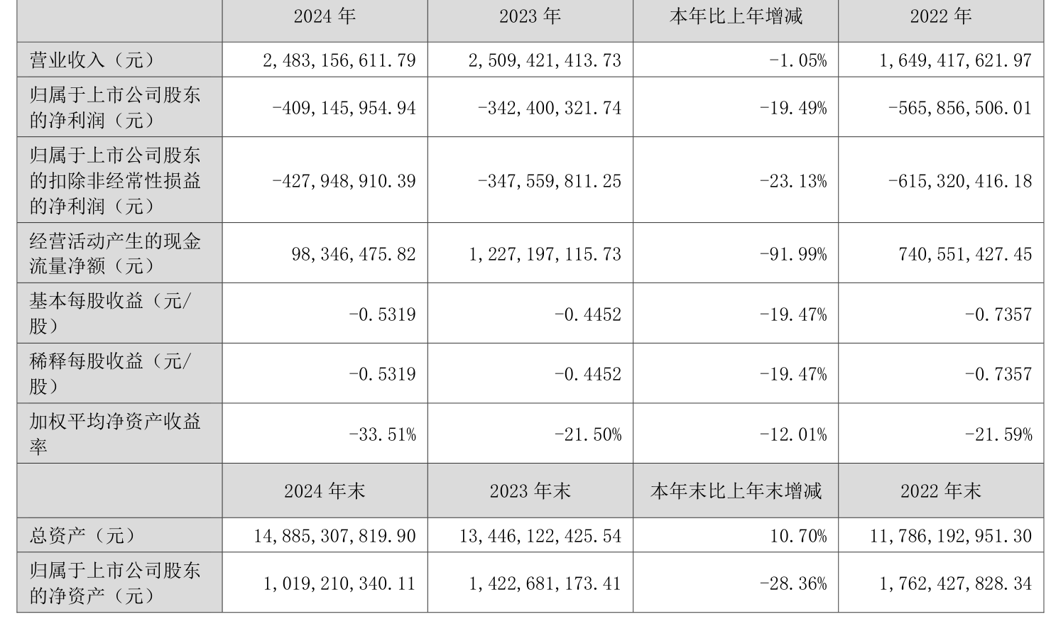 中证智能财讯新筑股份(002480)4月26日披露2024年年度报告。2024年,公司实现营业总收入24.83亿元,同比下降1.05%;归母净利润亏损4.09亿元,上年同期亏损3.42亿元;扣非净利润亏损4.28亿元,上年同期亏损3.48亿元;经营活动产生的现金流量净额为9834.65万元,同比下降91.99%;报告期内,新筑股份基本每股收益为-0.5319元,加权平均净资产收益率为-33.51%。