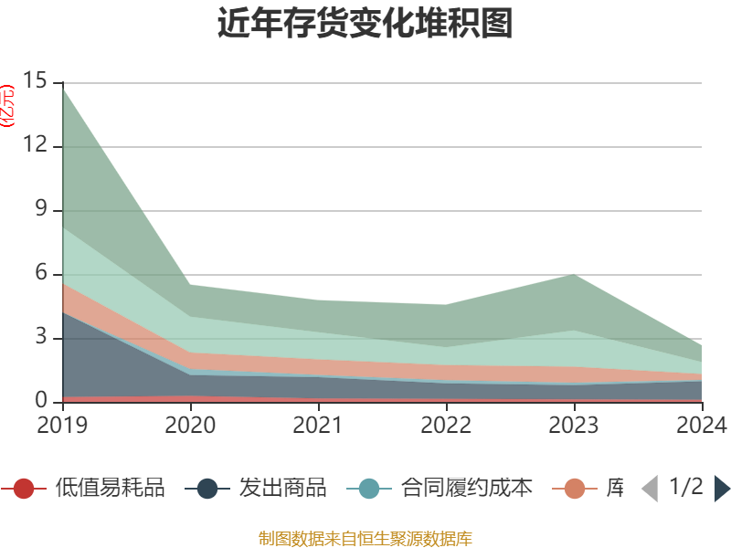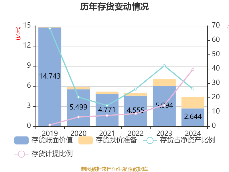 从存货变动来看,截至2024年末,公司存货账面价值为2.64亿元,占净资产的25.95%,较上年末减少3.35亿元。其中,存货跌价准备为1.73亿元,计提比例为39.54%。